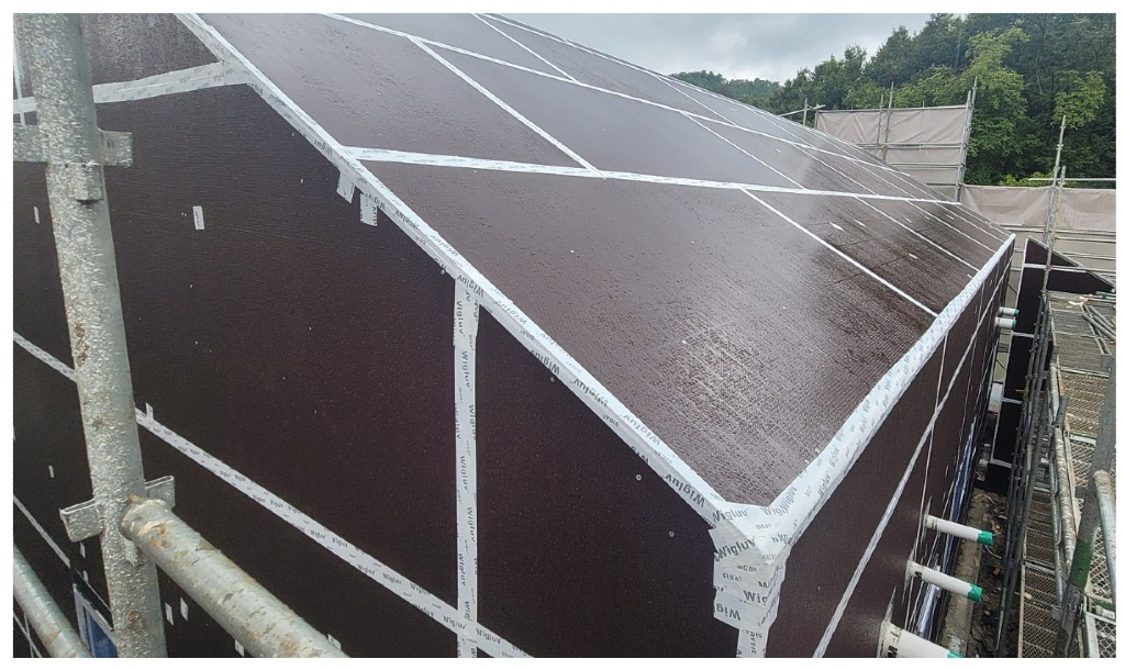 빗물이 지붕합판의 평편한 곳과 달리, 기밀테이프 가로 상부 엣지면에서 테이프 두께로 인한 표면 저항에 의해 빗물이 흘러내리지 못하고 맺혀 있는 상태이며, 만약, 테이프의 부착상태가 건전하지 못하다면 빗물이 테이프 안쪽 틈새로 타고 들어올 수 있는 상태입니다.