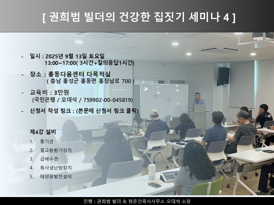 더 좋은 방법을 찾아가는 "권빌더의 건강한 집짓기 4차" 세미나를 진행합니다.
