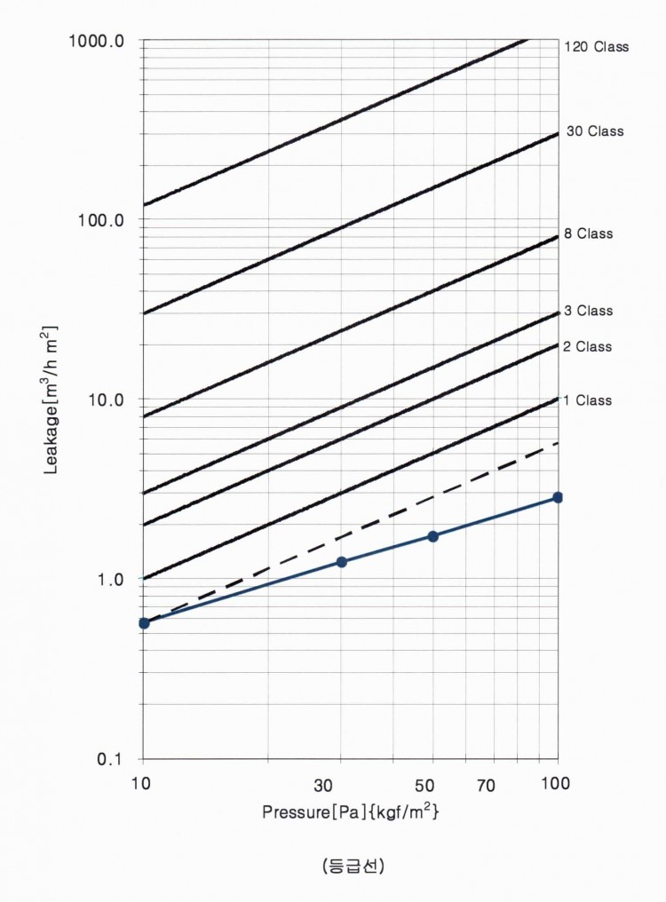 만약 우리나라 시험성적서의 전체 페이지를 다 보유하고 있으면 뒷 장에 각각의 압력에서의 누기량이 나와 있으므로 계산이 용이하다.
