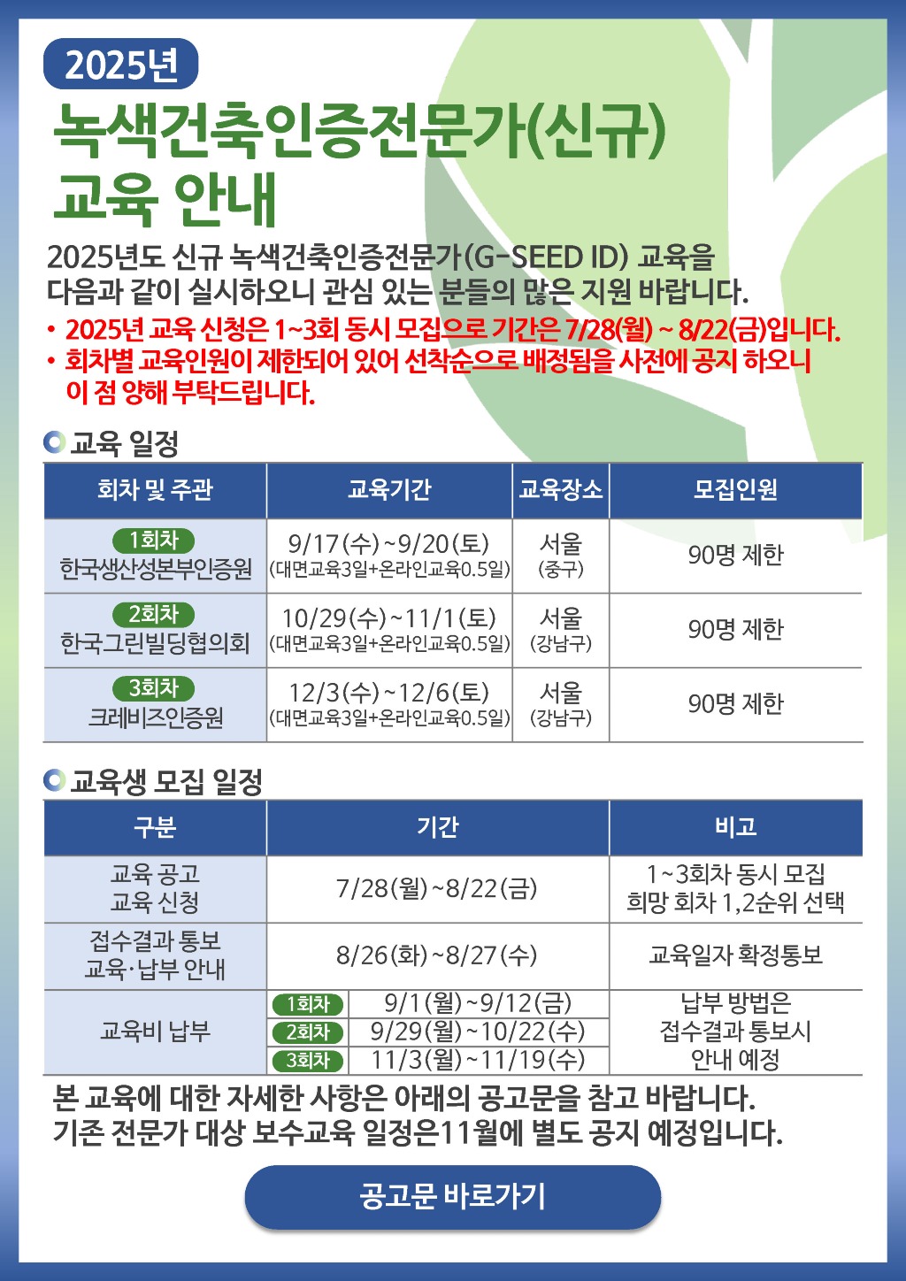 [홍보] 2025년 녹색건축인증전문가(G-SEED ID) 교육 안내