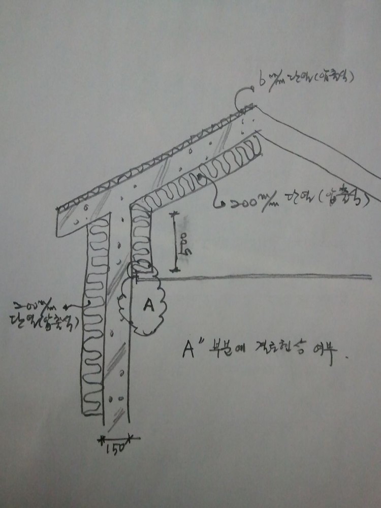 애매한데요.. 수치상으로는 아주 미세하게 벗어나나, 현재 지붕위 6mm 외단열이 아무 훼손없이 들어간다는 전제이므로 경험상으로는 생깁니다. 현재의 문제는 내단열의 두께보다는 500mm에 있습니다. 현실적으로 어려워보이나 아무래도 더 내려와야 합니다. 또한 실내측의 압출법은 일체타설하셔야 하구요.. 그래야 2차적 피해를 막을 수 있습니다. 감사합니다.