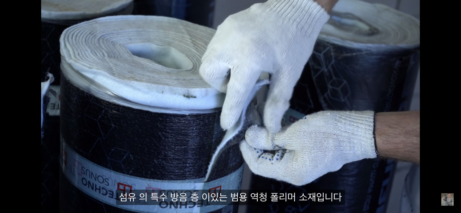 지붕용 방수시트에 고밀도폴리에스테르를 붙인 제품으로 보입니다. 즉 원래 바닥 소음방지재로 나온 것이 아닌, 지붕의 빗소리 등을 저감시킬 목적으로 나온 제품이며, 영상에서도 이 점을 언급하고 있습니다.