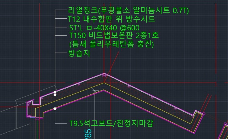 즉, 금속지붕-멤브레인-방수시트-내수합판-세로각재(통기층)-단열재-구조체 의 순서입니다.