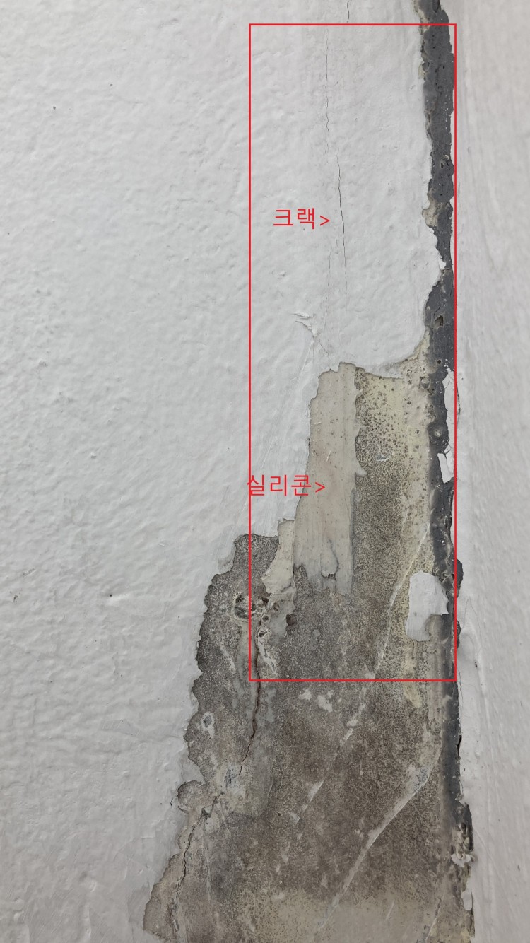 베란다에 실크랙이 있어서 걷어내보니 크랙을 실리콘으로 보수하였습니다.