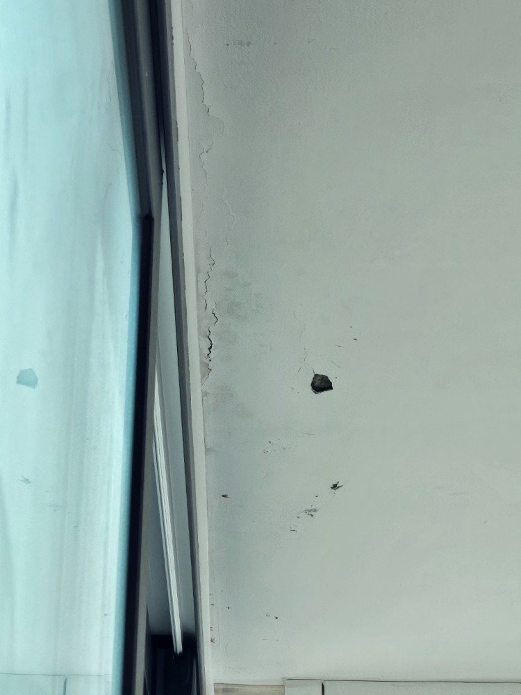 우선 사진상 위쪽 2개는 창호주변 빗물받이 부분이고 페인트가 탈락된 상태입니다.안쪽으로는 물기가 스며든 흔적이 보입니다.