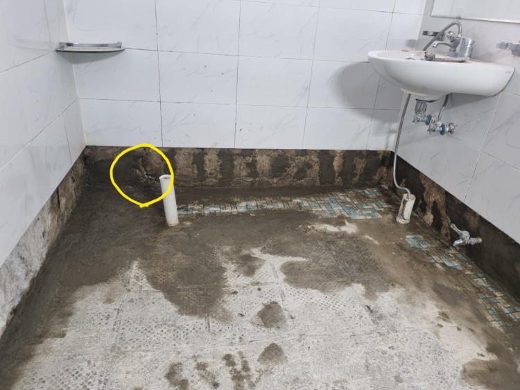 1년 전 욕실 공사 하자로 타업체 의뢰후 다시 방수 공사를 했는데 누수가 계속 잡히지 않아 전문 누수 탐지 업체에 문의 후 방수층 위 배관에 구멍이 난 것을 발견했는데요!