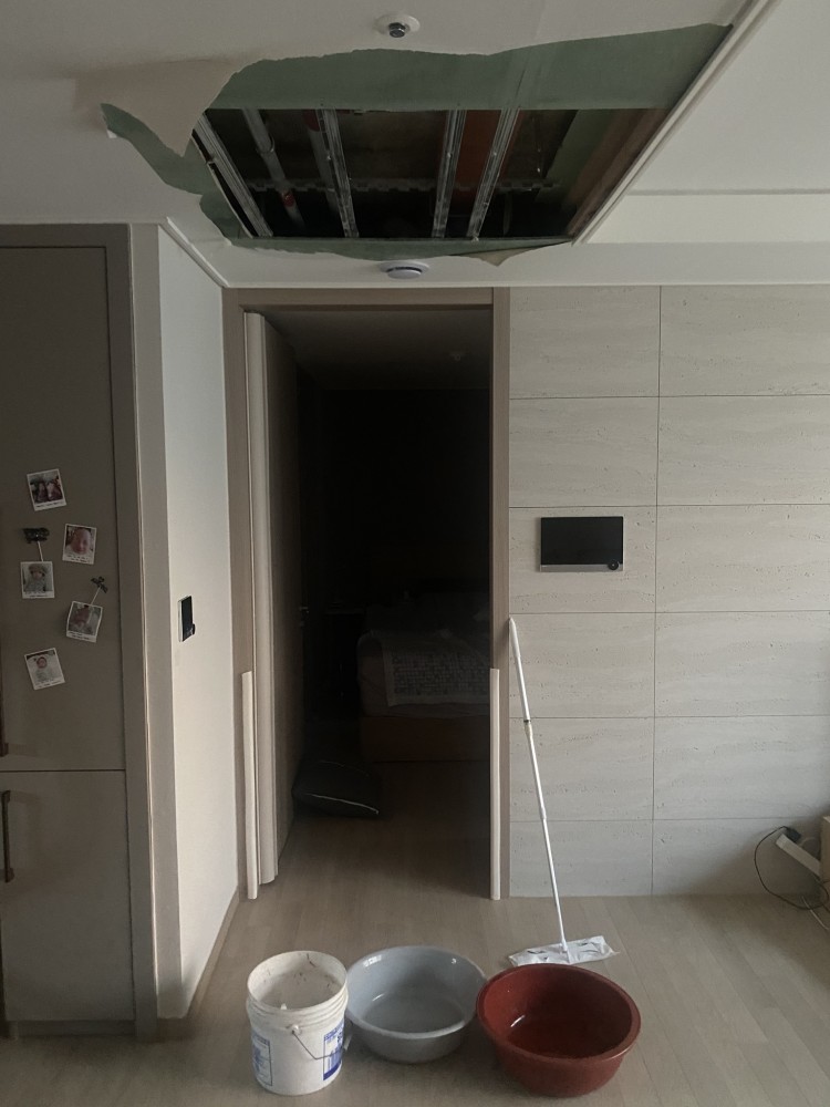9/1(화) 오전에 본사직원 방문 후 누수세대 윗층 점검을 요청하여 윗층 바닥 타공까지 진행하여 검사 하였으나 원인은 찾지 못하였고 건설사 및 시공사의 과실 미루기만 진행하다가 별다른 조치 없이 당일 퇴근하였고 실거주자인 저희쪽에는 9/2까지 원인 규명(내시경 검사) 후 과실업체 선정 후 향후 계획을 알려주기로 하여 당일 불편함을 감수하며 자택에서 밤을 보냈습니다.
