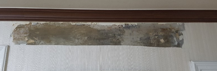8층 벽면에 누수가 보이는 쪽 벽지를 잘라 내고, 물이 나오면 그때
