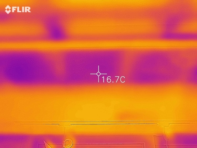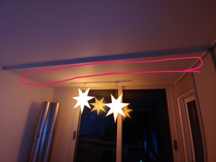 사진에 표시한 부분이 내부 샤시가 있던 자리로 콘트리트벽이 다른곳보다 70mm 정도 내려와 있는데 공사업체에서 바깥쪽은 아이소핑크 50mm를 넣었는데 사진에 표시한 부분은 콘트리트 천장면에서 30mm 정도만 띄우고 석고보드로 덮어 버린듯합니다. 열화상 카메라로 찍어보면 해당 부분만 파랗게 나오네요. (오늘 아침에 보니 안쪽에서 결로까지 생긴듯 합니다. 실크벽지인데 마지막 사진처럼 되어 버렸네요 ㅜ.ㅜ) 확장부분 벽면도 단열재가 너무 얇아서 문제이긴 하나 여긴 커튼으로 덮어버리니 좀 괜찮더라구요.