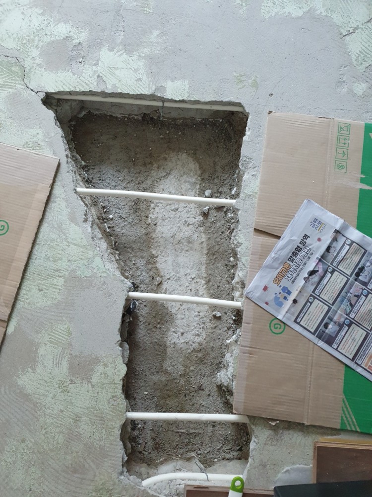 그래도 계속 아랫집에서 물이 계속 떨어져서 2월 말에 저희집 주방 바닥을 팠습니다.(사진)