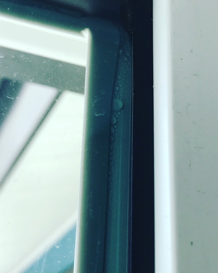 사진속에 보이는 물방울은 바깥쪽 유리창의 안쪽에 발린 실리콘에 맺힌 물방울 입니다
