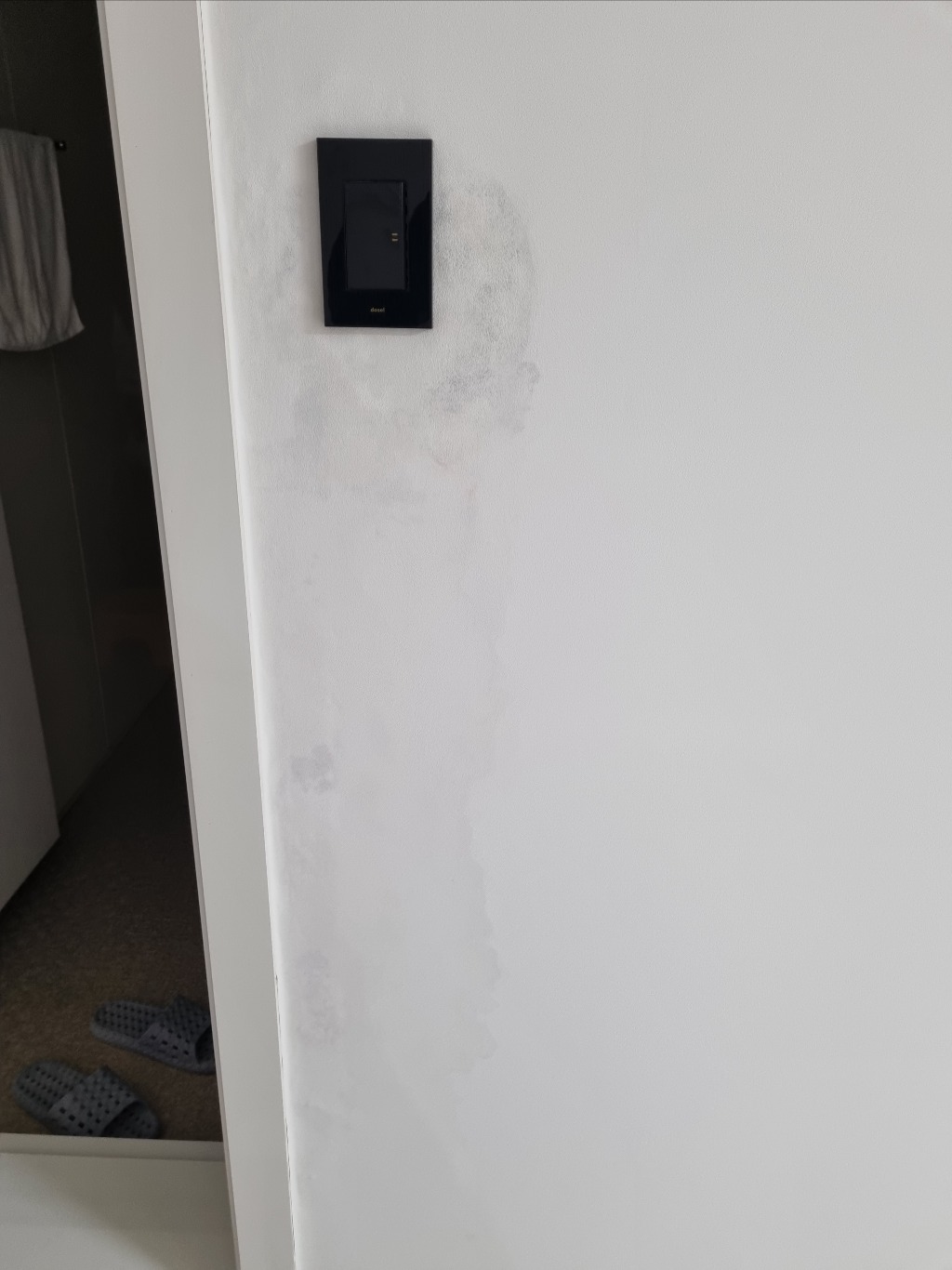 화장실 벽면이고 스위치부분부터 중간부분쪽만 누수처럼 저렇게 되어 있습니다. 서서히 진행되어서 처음에는 발견못했습니다.