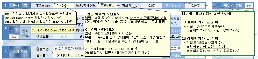 참고로, 여기서 침기율이 최종적으로 0.046/h (=0.046 ACH, Air Change per Hour)로 계산되었는데, 이는 1시간 동안 실내 체적의 4.6%만큼의 외기가 실내로 유입되는 것으로 이해할 수 있겠습니다.