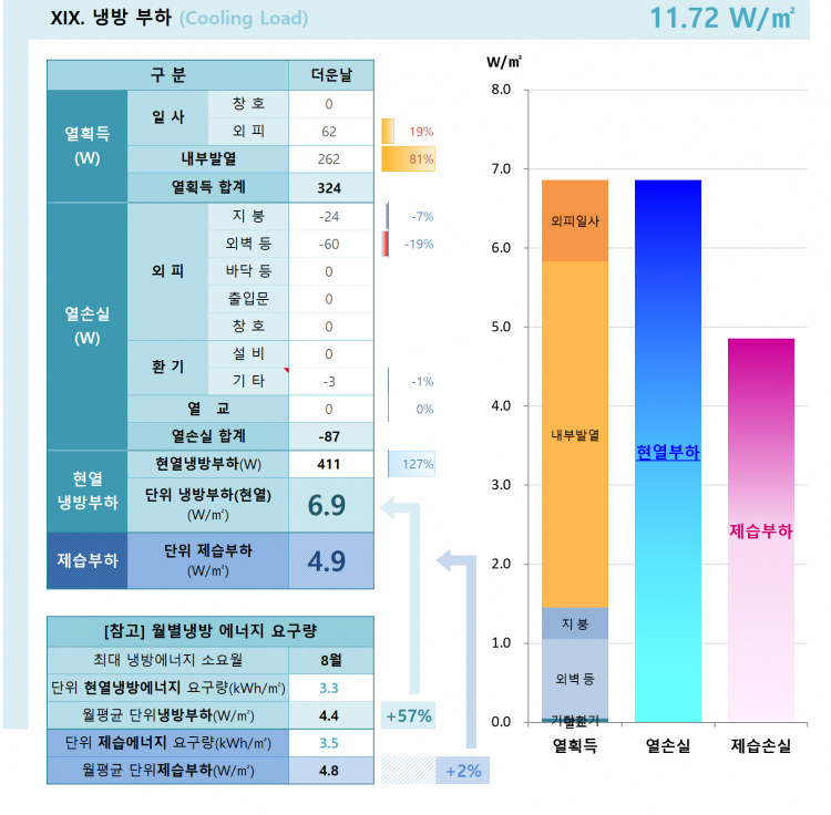 1. 참고 라고 되어있는 왼쪽 밑 부분 표의 월평균 단위냉방부하값과 월평균 단위제습부하 값을 더한 값이 8월달의 냉방부하 값이 되는겁니까?