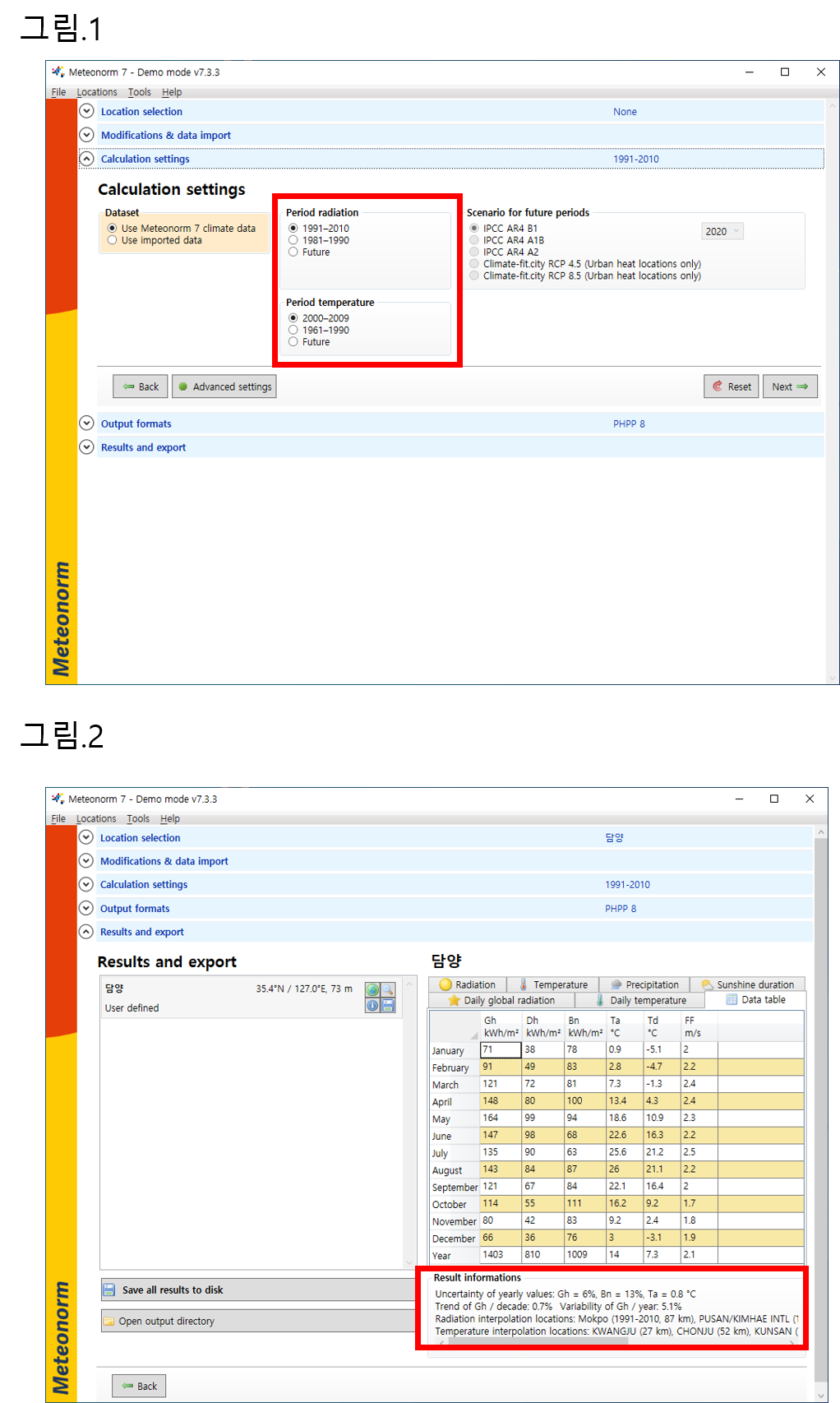 그림1은 기상데이터 구간 설정하는 메테오넘의 설정칸이며, 그림2는 만들어진 기상정보가 주변 어느지점에서 기후데이터를 참조하였는지를 알려주는 정보 입니다.