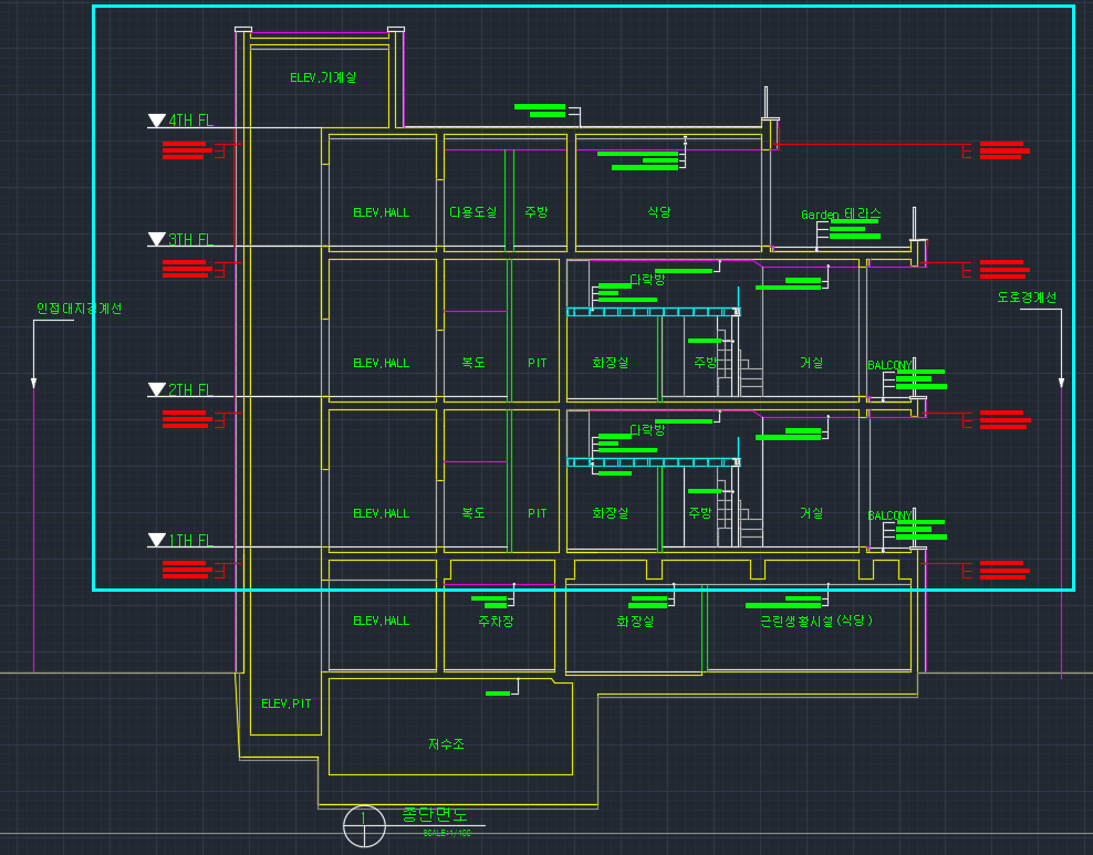 2,3,4층 주거 부분을 하나의 존(아래 단면도에서 박스 부분)으로 보고 해석한다면 건물은 비난방 공간(1층 근생 부분) 위에 얹혀 있다고 가정하시기 바랍니다. 저는 입력해주신 '2층바닥 노출부'라는 것이 잘 이해가 안가는데요.. 어쨌든 '비난방 공간'의 '천장'으로 2층 바닥 슬라부 부분의 외피구성을 선택해 주시면 되겠습니다.