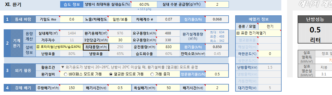 요구풍량의 경우 각각 환기용체적과 1인당급기량에 따라 산출하고 환기설계풍량의 표준값과 최소값을 활용하여 운전풍량을 산출하니 415가 나와 요구풍량1보다 작은 값이여서 기기를 2개 사용하여 830이라는 값을 넣었습니다. 그러니 난방성능이 0.5리터가 산출되었는데 혹시 환기 시트에서 더 수정해야하는 사항이 있나요?