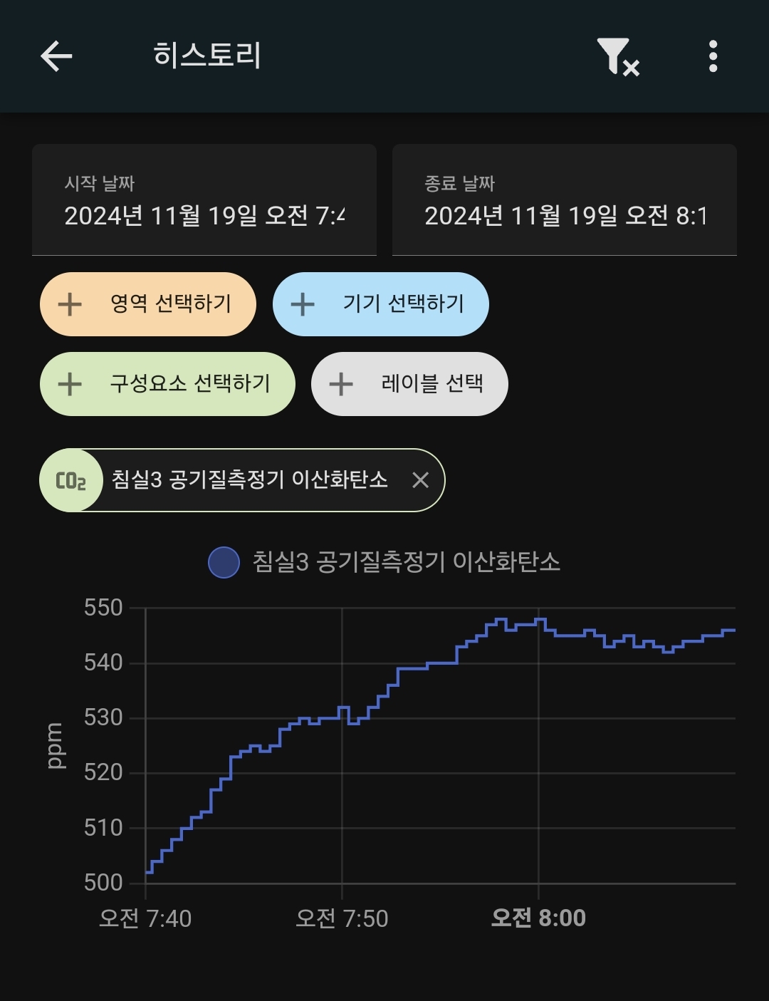 대략 RA CO2 농도 1200ppm 일때 밀폐된 방에서 CO2농도가 450ppm 에서 550ppm으로 오릅니다.