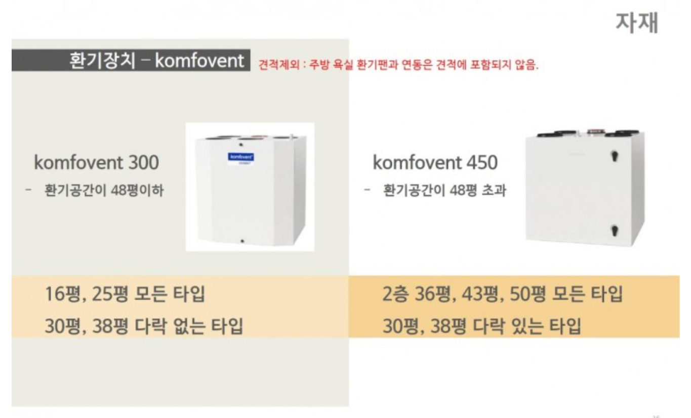 이건 제가 답을 드릴수 있네요. 표준주택의 비용은 컴포벤트 전열교환환기장치를 포함합니다. 환기공간 면적에 따라 컴포벤트 300 또는 450 모델이 들어간다네요. 구체적인 내용은 아래 표준주택 상세스펙을 참고해주세요.