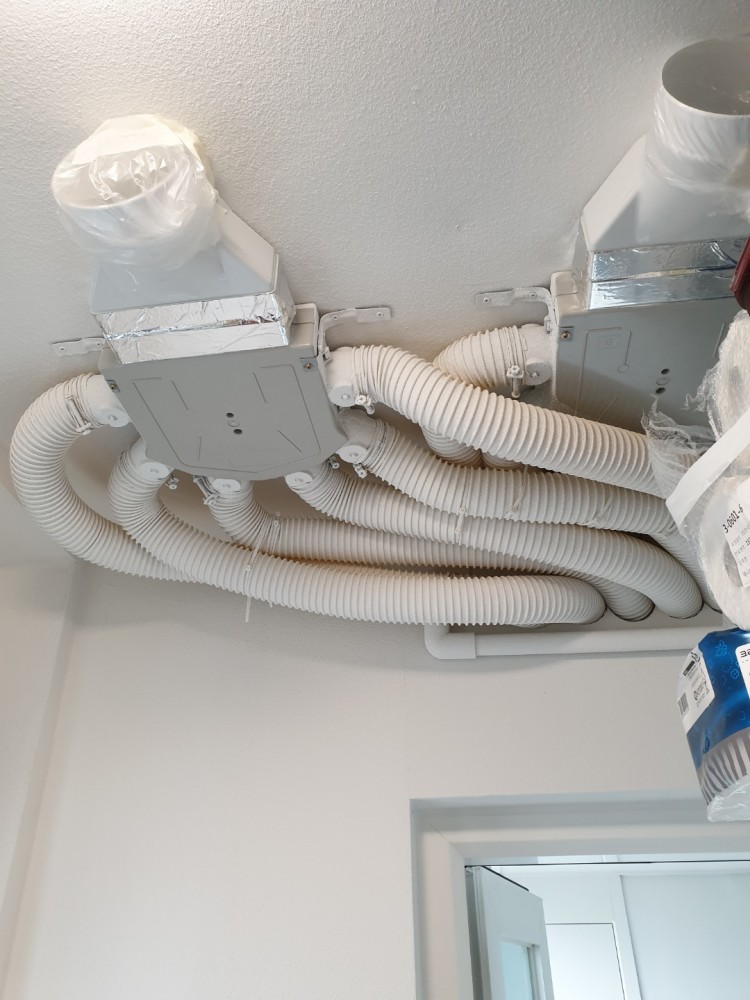 전열교환기와 필터박스 및 소음기 사이즈 감안하여 천정에 분배기가 설치되어 있습니다.
