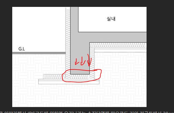 홍도영건축가께서 지적한 바와 같이 상부의 그림은 IRC에 나와있는 이해를 돕기위한 그림입니다. 그림에서는 목구조의 외벽선이 내려오다가 기초 측면의 단열재와 연속되어져 있지 않은 것을 지적한 것입니다. 옳바른 디테일은 목구조 외벽을 조금 외부로 빼내어 하부 기초 수직단열재와 일치시켜주어야 한다는 이야기 입니다.