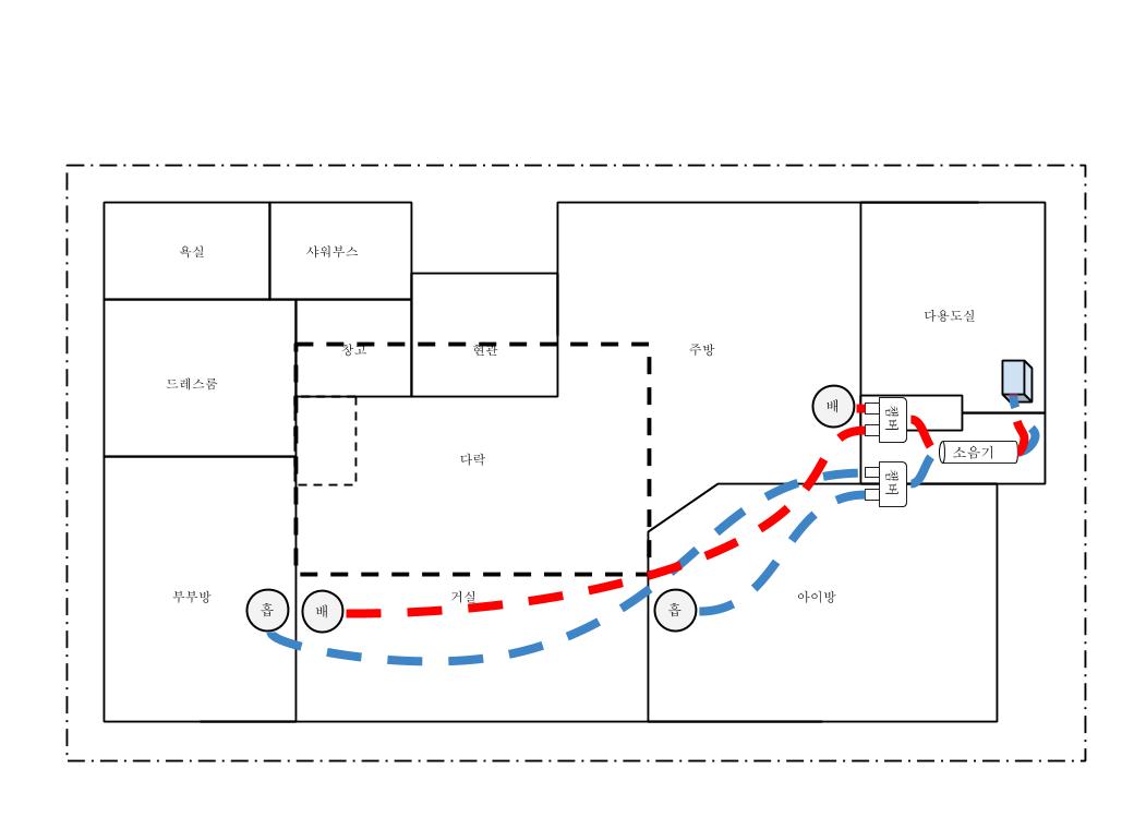 거실과 장치의 사이에 있는 벽체에 구멍을 내면 가장 쉽게 덕트를 해결할 수 있었을 텐데.. 콘크리트 벽체에 구멍을 내기위해서는 전문적 장비가 필요하고, 모두가 같이 사는 공동주택 벽체에 함부로 구멍을 낼 수도 없는 노릇이라, 작업이 힘들더라도 이사갈 때 깨끗이 원상복귀할 수 있는 방향으로 계획을 수립하였다. (물론 덕트 작업 중 후회한 부분이기도 하다.)
