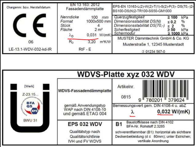 먼저, 유럽에서는 잘 알고 있는 CE 로고가 있고 각 회사의 제품에 열전도율값을 기입을 해서 판매를 할 수 있는데 이는 서로의 비교를 위한 값에 의미가 있지 어떤 질적인 것을 보장하는 그런 장치는 아닌 것으로 압니다. 그래서 독일에서는 DIN EN ISO 6946에 따라서 열관류율을 계산하기에 생산업체에서 CE에 맞춘  λD 즉  λDeclared의 열전도율을 사용할 수가 없고 만일 이 값을 이용한 열관류율을 계산하려면 안전보정치로 1.2를 곱한 값을 사용하게 됩니다. 이 방법은 20%가 나빠지는 결괴입니다.