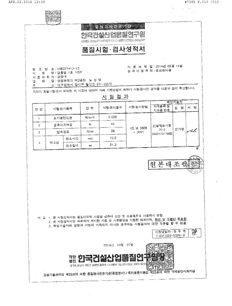 단열재 시험성적서가 얼마이든 간에, KS 규정에 의한 장기 열전도율만으로 평가를 하고 있습니다.