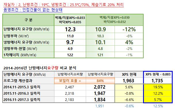 현재의 난방에너지요구량의 증감추세로 보면, 내년정도면 0.030을 적용한 계산결과에 가까워질것 같은 판단입니다. (물론, 콘크리트 내부 수분증발에 의한 안정시점과 XPS경시변화에 의한 저하율에 따라 변수가 발생될 수 있겠지만요..)