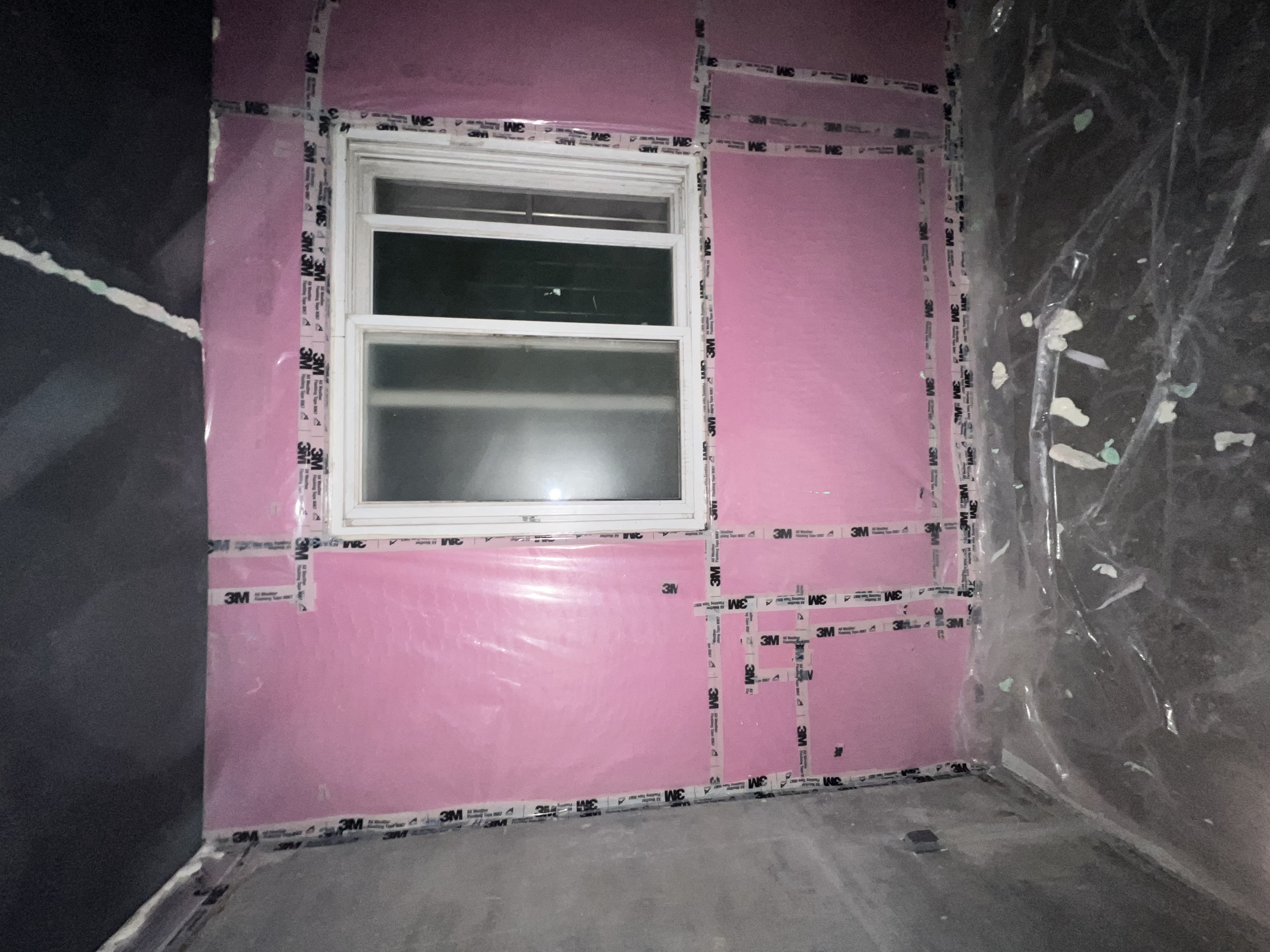 외벽에 우레탄접착폼으로 50t 압출법단열재를 부착하고, 압출법단열재 사이사이 및 압출법단열재가 바닥, 천정, 벽면과 맞닿는 부분에 기밀테이프(3m 8067)를 붙인 후 pe비닐로 외벽을 한번 더 덮었습니다. Pe비닐 접착도 동일한 기밀테이프로 하였습니다.