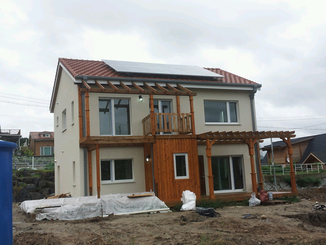건축물은 필지 내에서 서측모서리에 배치하였고, 지붕마감재인 점토기와위에 태양광 3kwp를 설치하였습니다. 내부벽 마감재는 한지벽지이고, 천정은 레드파인루바입니다.