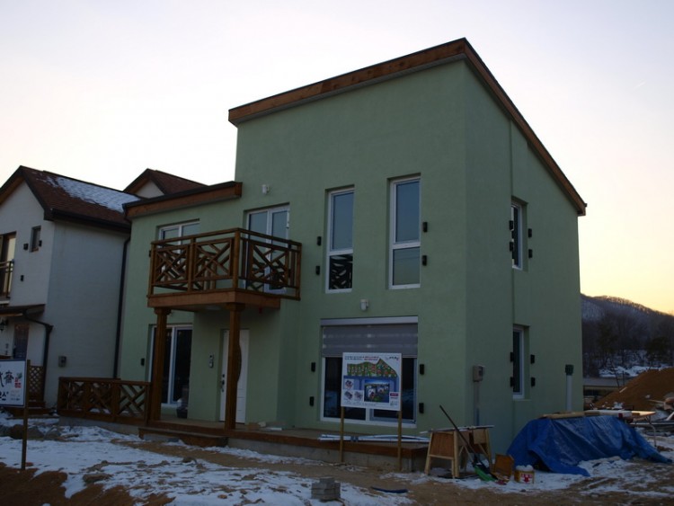 아랫쪽의 시공사진에서 보듯이 건물의 각각의 부위를 지상에서 제작을 한 다음 유압기를 이용하여 구조체를 들어올린후 벽체를 시공하는 방법을 사용한다. 작업자의 안전과 능률을 향상하기 위해 비계등을 사용하여 높은 곳에서의 작업을 최대한 줄여, 공기와 시공비를 줄이기 위한 공법으로 지어진 것이다. 패널을 공장제작한 후 현장에서 시공하는 조립식건축물이라 할 수 있는데, 단열과 기밀을 엄격히 적용하여, 고효율의 건강한 주택이 지어진 사례이다.