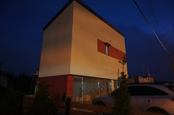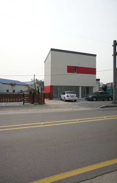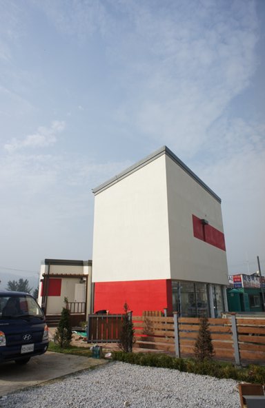 도로변의 2층 매스는 1층의 경우 에너지절약형이 아닌 일반 상가로써 계획하였기 때문에 열교현상을 최소화하기 위하여 1콘크리트매스위에 목조주택을 얹히는 식으로 디자인하였다.