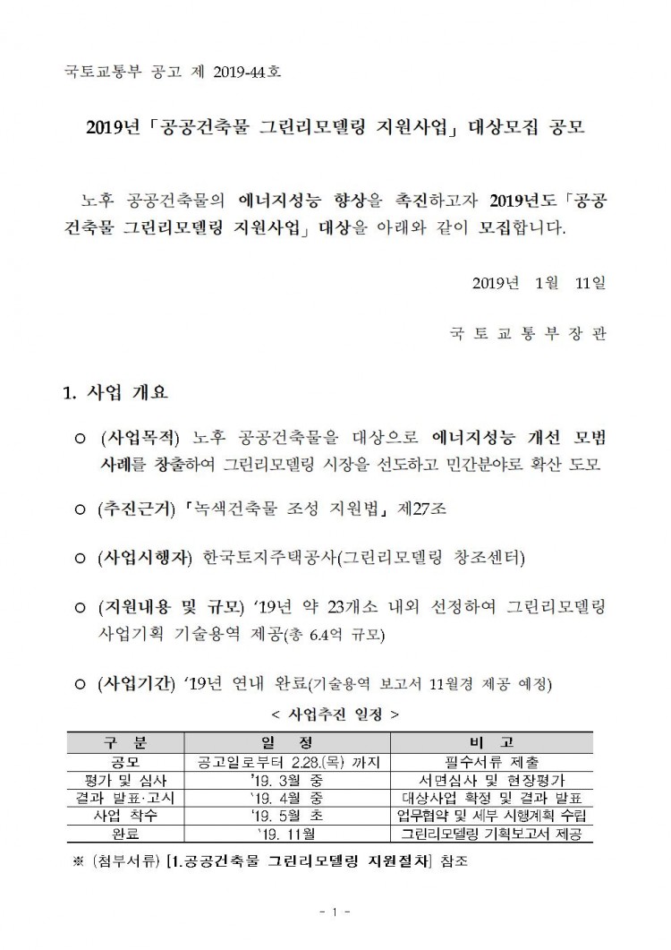 2019년 '공공건축물 그린리모델링 지원 사업' 대상모집 공고