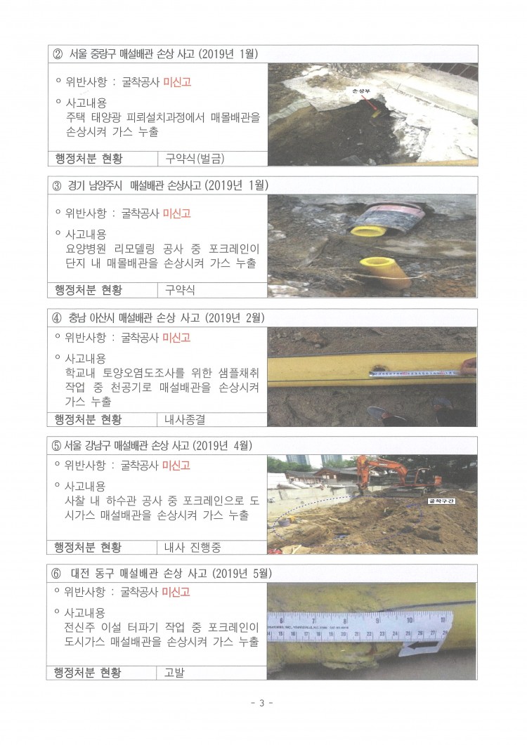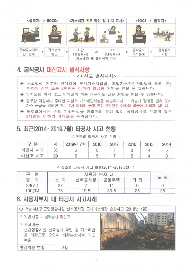 - 도시가스사업법 제50조(벌칙) 도시가스배관 매설상황의 확인요청을 하지 아니하고 굴착공사를 한 자는 2년 이하의 징역 또는 2천만원 이하의 벌금에 처한다.