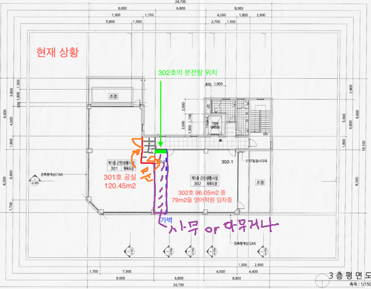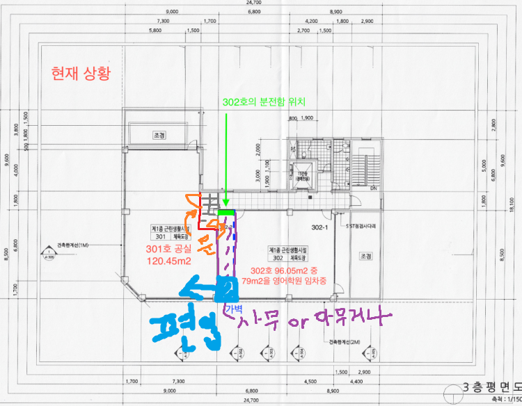 302호의 임차인이 전체가 필요하지 않다고 하여 302호에 가벽을 설치하여 96.05m2 중 79m2을 영어학원으로 임차 준 상황입니다.