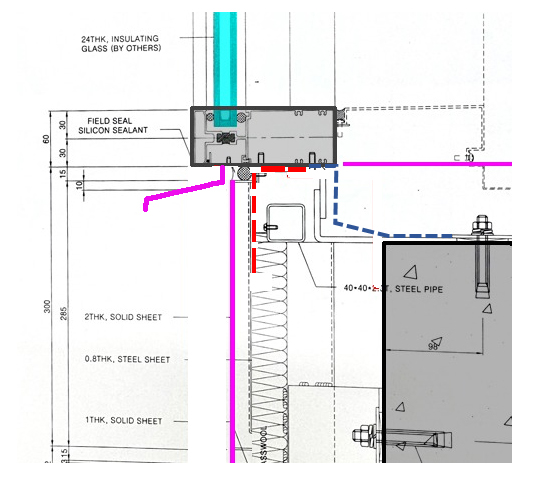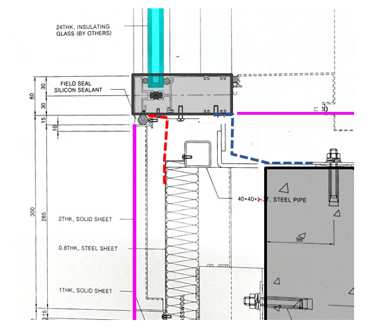 그리고 혹시 그려주신 방수테이프가 단열재 위에 붙이고 외부방향으로 꺾어서 커튼월 하부면에 접착되는데 이것이 혹시 내부방향으로 꺾어서 붙였을 시에도 기능상 문제가 없을까요?(빗물받이를 커튼월하부에 붙이려니 자리가 안나올 것 같아서요)
