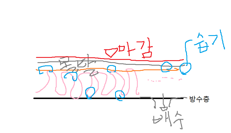 방수층위로 단열이던 마감이던 쌓여있게되면 그 틈세틈세로 물이 잘 빠져나가지 못하고 갇힐 수 있다는 말입니다