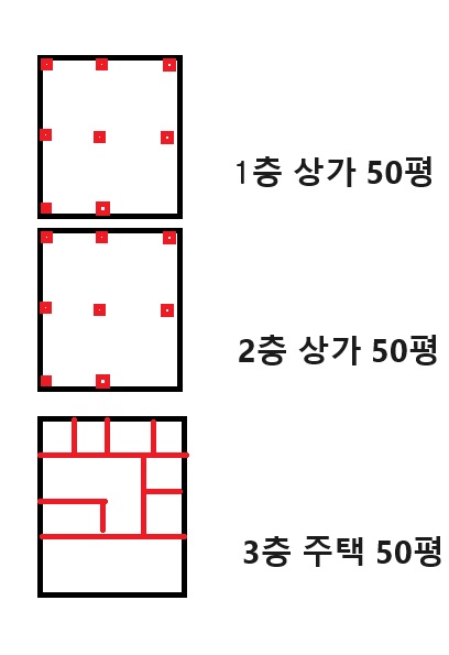 철근콘크리트 1층 상가, 2층 상가, 3층 주택입니다