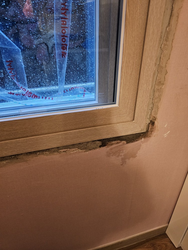 그리고 방 안에 있는 사진을 보시면... 여긴 우레탄 폼 쏴달라 해서 빈 곳 겉에만 대충 쏘긴 했어요. 저도 협회님의 유튜브를 대부분 챙겨본 사람으로 우레탄폼 시공이 얼마나 중요한지 알기에 텅텅 비어있는 공간은 좀 채워달라고 해서 그래도 조금 채운 건데(비어있는 안쪽엔 쏘지 않고 겉에 보이는 부분만 쏘시더라구요. 그리고 내부에서만 쏘고 외부에선 쏘지 않았어요) 이분들 말씀으론 우레탄은 다 채울 필요 없다고 하시며 우레탄은 보통 창호 고정을 위해서 쏘는 거라고 말씀하시더라구요. 그리고 우레탄은 창호 고정용이지 안에 시멘트를 채워 넣는 게 더 좋다고 시공에 더 신경 쓰는 경우엔 우레탄을 제거하고 그 안에 시멘트로 채워 넣는다고 하시네요. 결론은 우레탄은 필요없고 몰탈(시멘트 마감)만 잘 하면된다고 하셨어요. 그래서 이쪽 창호는 안쪽과 바깥 쪽에 몰탈 마감을 하였습니다. 몰탈 마감 후 5일 뒤에 비가 왔습니다. 그날 물이 새어서 시간이 지난 뒤 바닥까지 물이 고였어요. 이쪽 창호는 건물 뒤편이라 드라이비트 외벽 마감을 합니다. 대리석+실리콘이면 그래도 방수가 확실히 될 거 같지만 드라이비트는 접착하는 면에 공간도 생기고 그 사이로 물이 흘러 들어오면 사진처럼 똑같이 물이 새지 않을까 걱정이 되네요. 이 부분도 업자분께선 케미컬을 쏜다고 하는데 도대체 그게 뭔진 잘 모르겠습니다. 내일이나 오시면 다시 물어보겠습니다.
