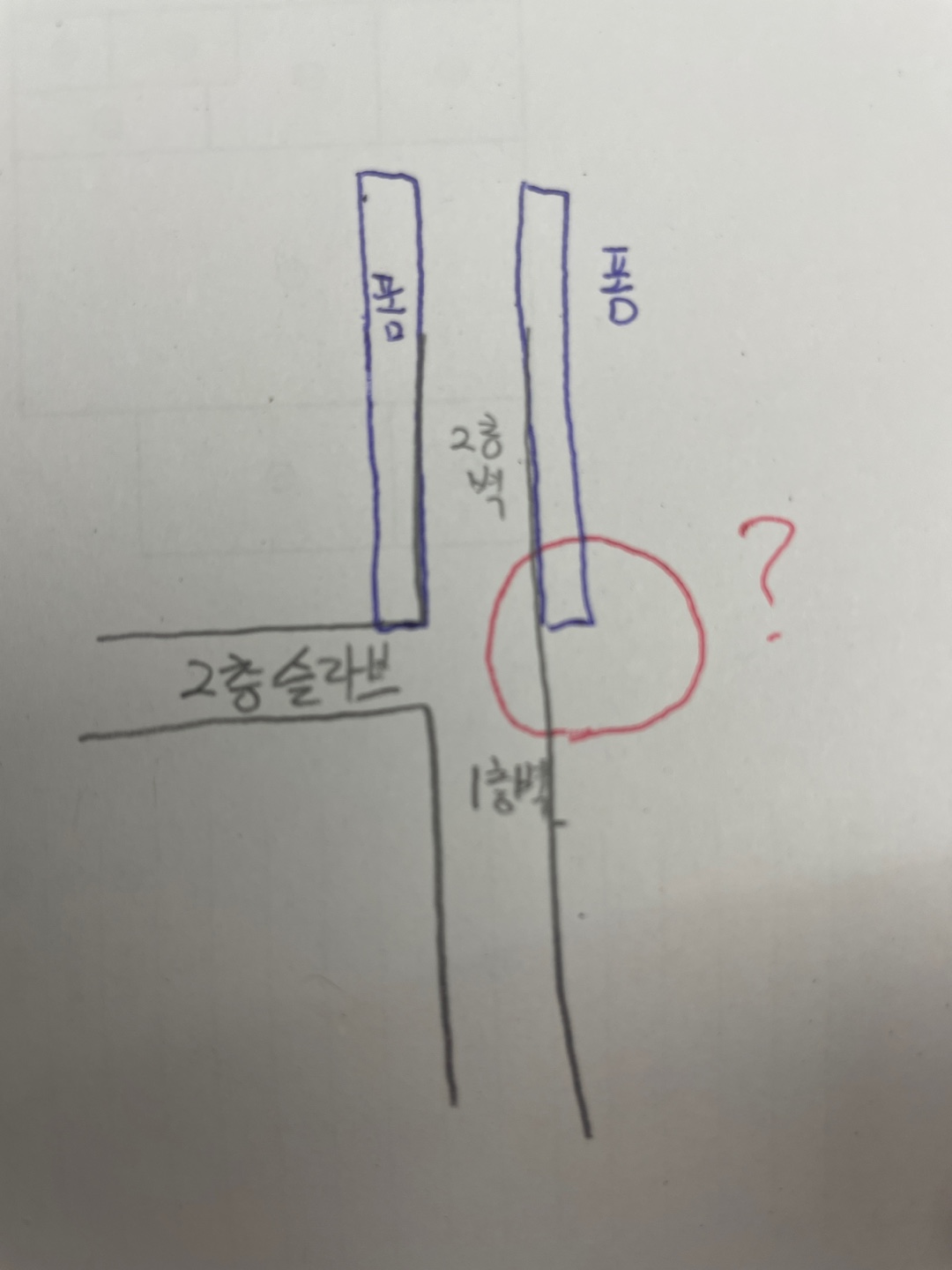 2층벽체를 올리려고 할때(2층 슬라브 타설완료후), 내벽은 슬라브위에 수평목깔고 하면되는데,