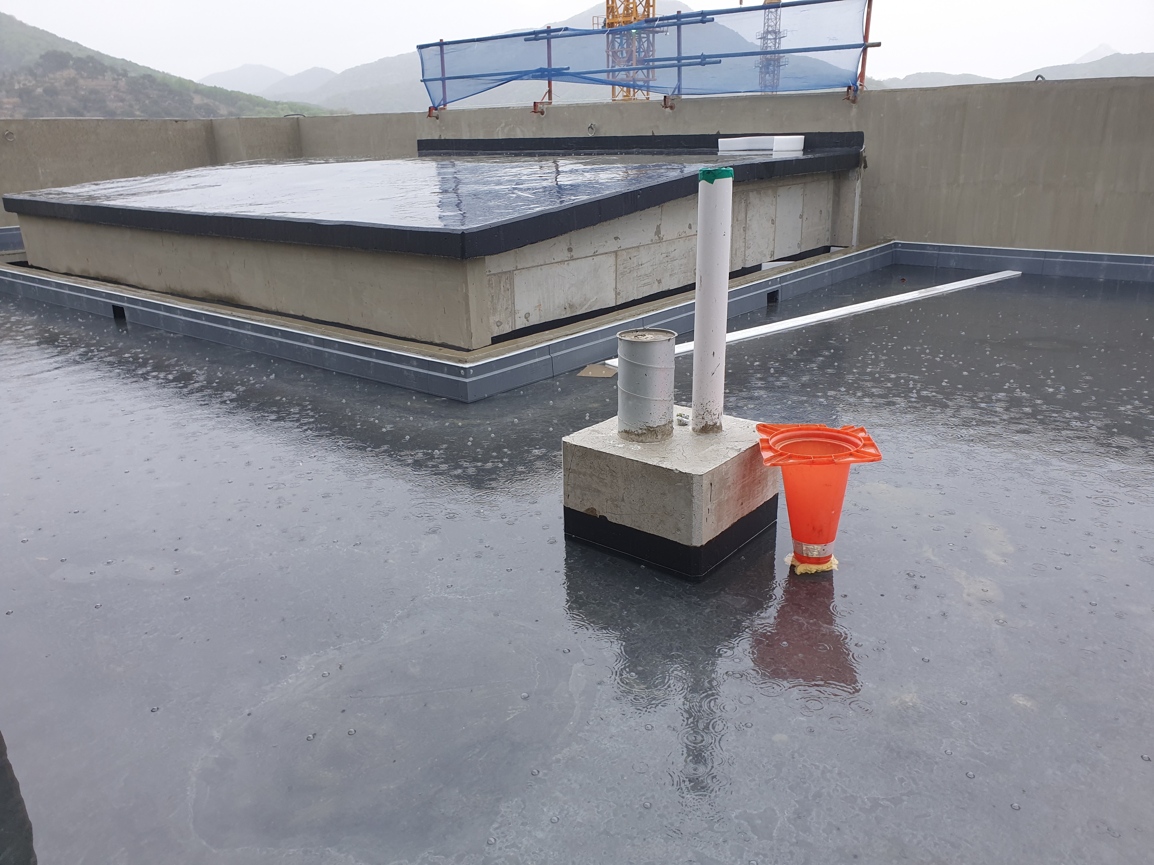 올린 사진은 어제 오전 도막방수가 시공된 공동주택 옥상 담수시험 장면입니다. 비가오면 자연 담수가 되기도 합니다.