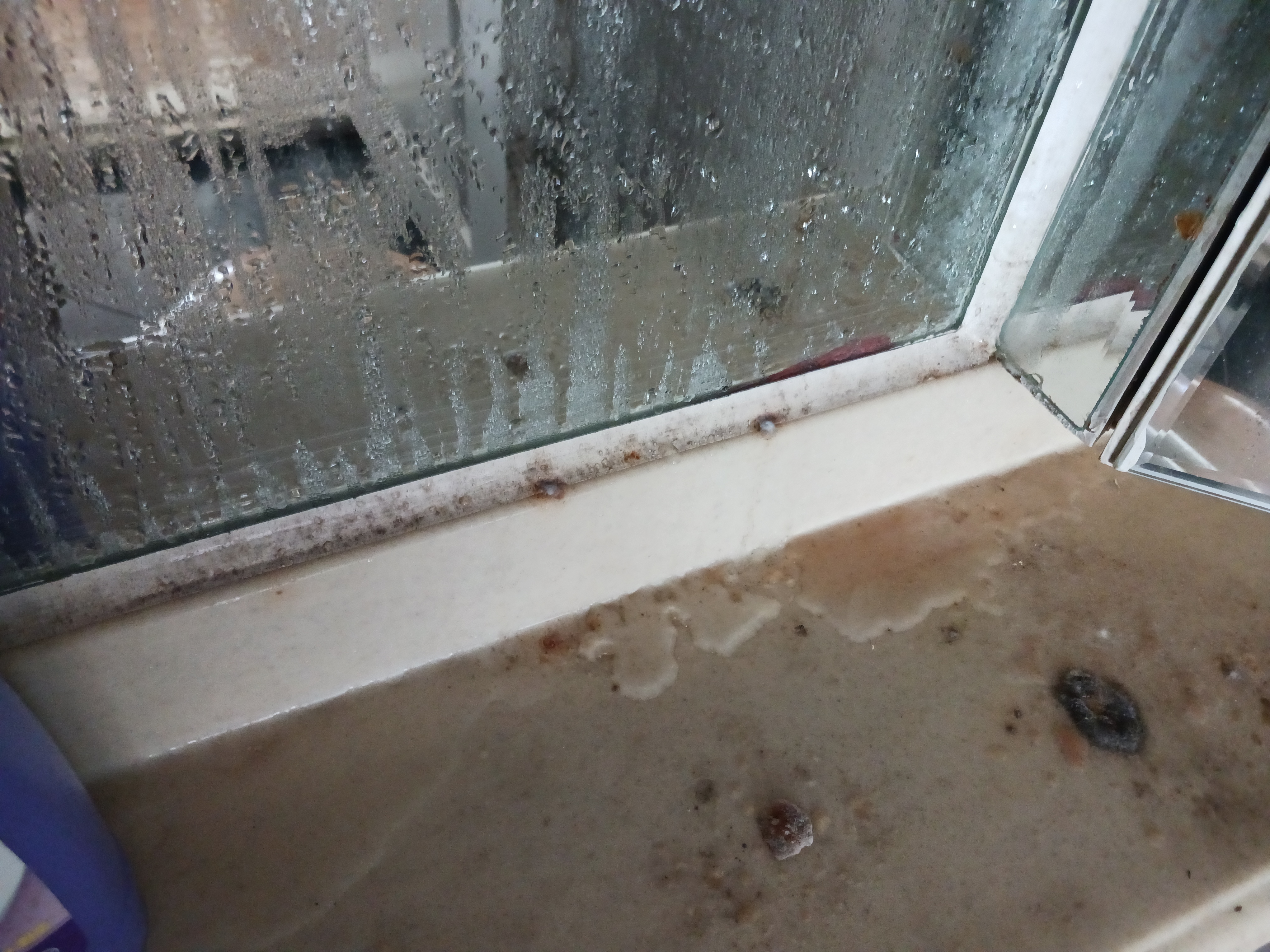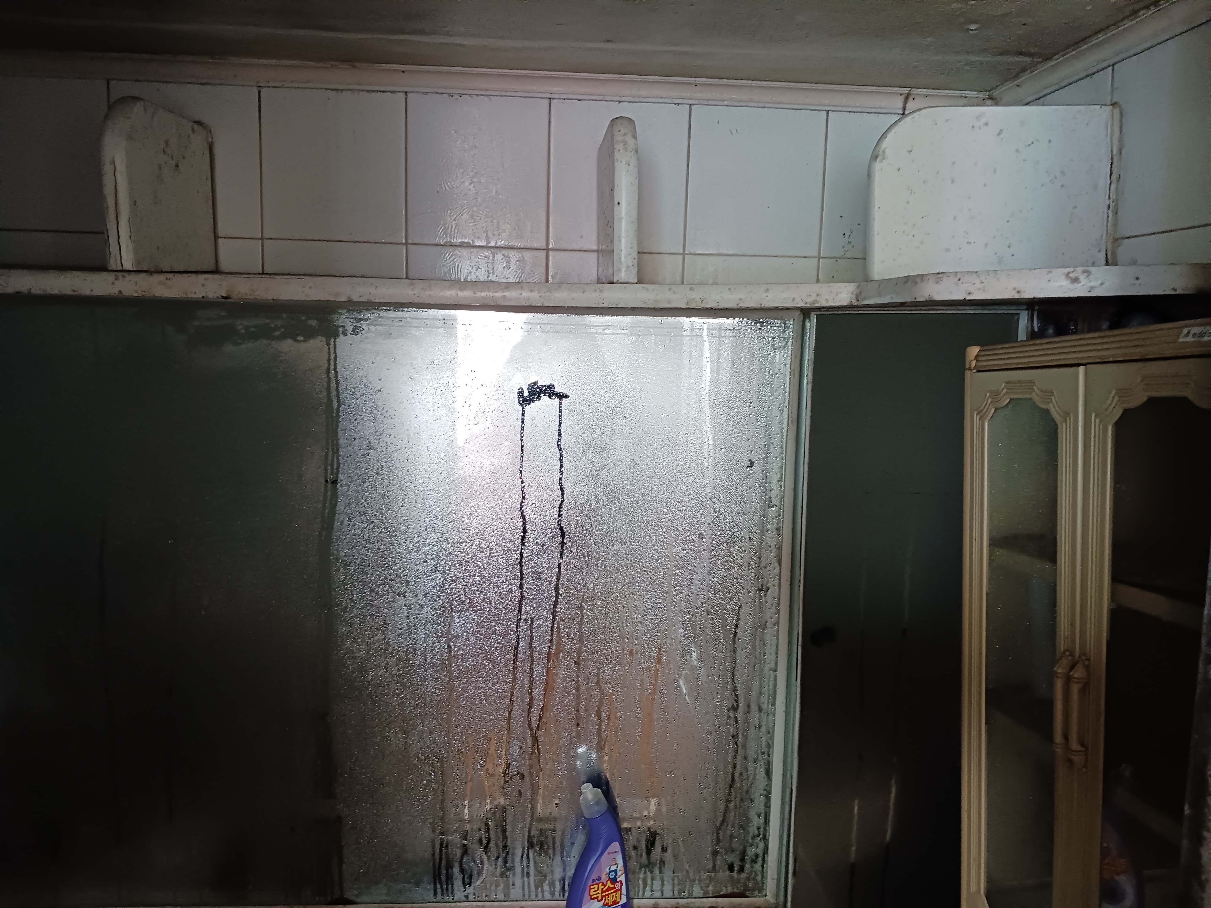 저희집 아파트 거실에 있는 화장실 벽쪽 천장에 물방울이 많이 맺혀져 있고 한쪽 벽면에 전체에 설치한 큰유리장에 유리전체에  물이 흥건히 뭍어 있습니다.  화장실 도어 밖에까지 곰팡이가 피어나고요.