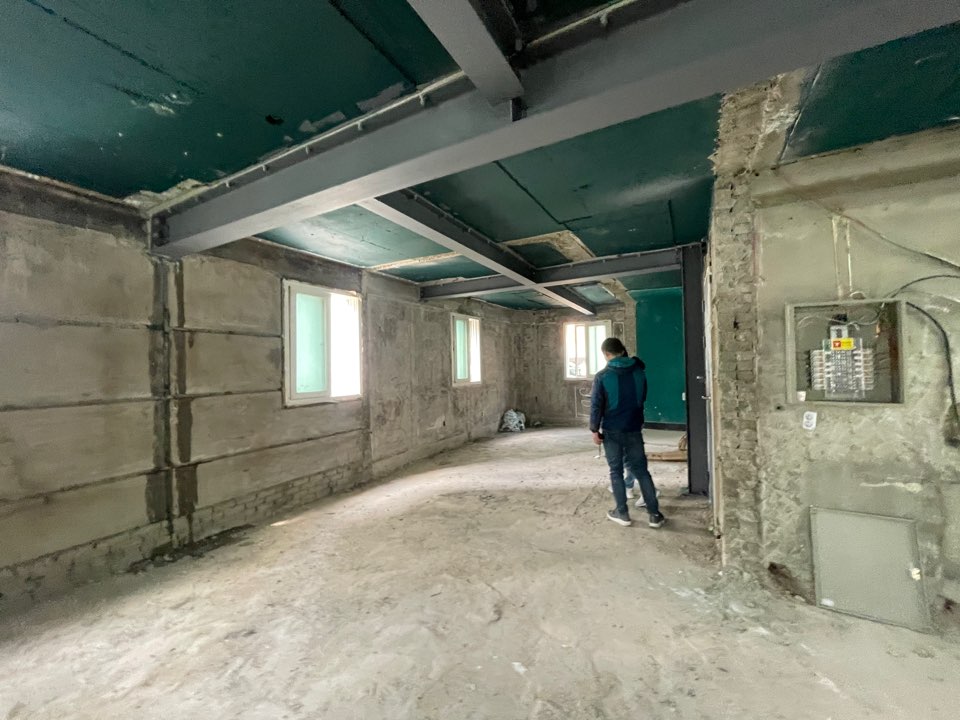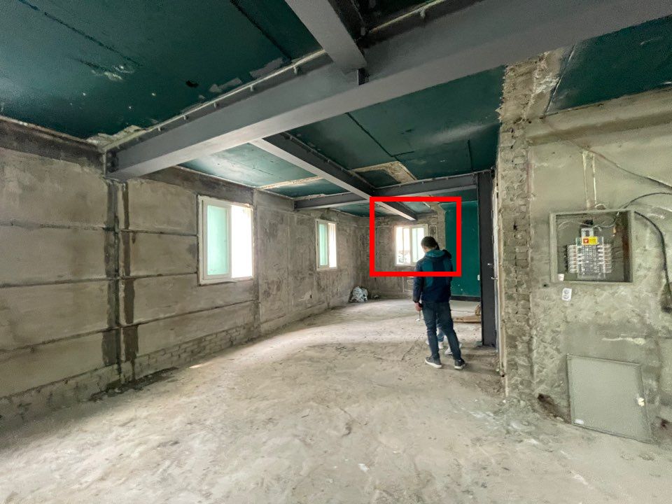 H빔은 4층 하중을 받는 보에 설치되었고, 화장실 앞에 기둥 H빔이 하나 있으며, 나머지는 하중은 가장 바깥쪽 벽들이 받치고 있습니다.