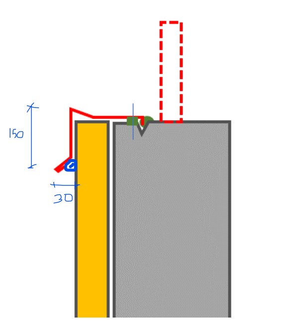2. 0.8T 이고, 짧은 후레싱이기에 각파이프로 물매를 형성하지 않아도 괜찮습니다. 고정을 방법도 번잡할 것 같고요. 이럴 때는 아래 그림과 같이 끝단을 치켜 올리는 방식으로 절곡을 하는 것이 유효합니다.