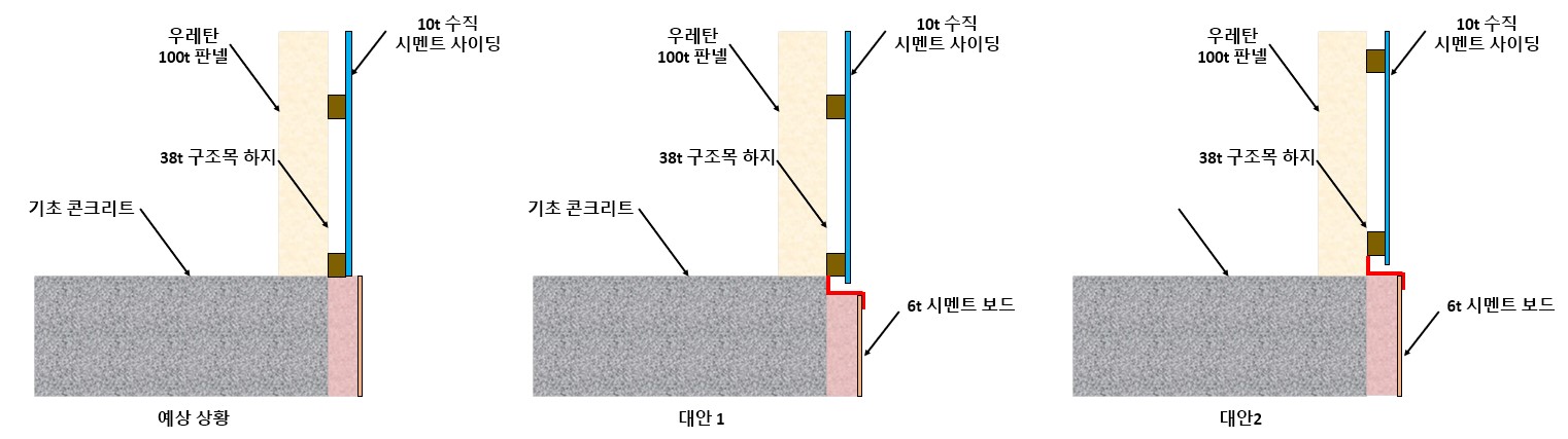 기본적으로 기초 콘크리트보다 외장마감이 더 튀어나와야 되는것으로 아는데, 설계초기에 스타코 마감을 하려다가 중간에 시멘트 사이딩으로 변경하면서 위와 같은 현상이 발생하였습니다.