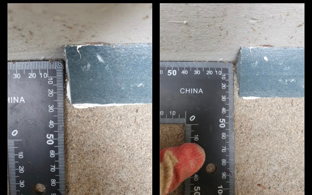 나. 그럼에도 불구하고 합판과 콘크리트 바닥이 만나는 선이 그림처럼 직선도 아니고, 수평도 아니므로 틈새가 많이 벌어질 수 있습니다. 그러므로 삼각면귀를 42mm 가 아닌 하나 더 큰 크기로 준비를 하시는 것이 좋겠습니다.