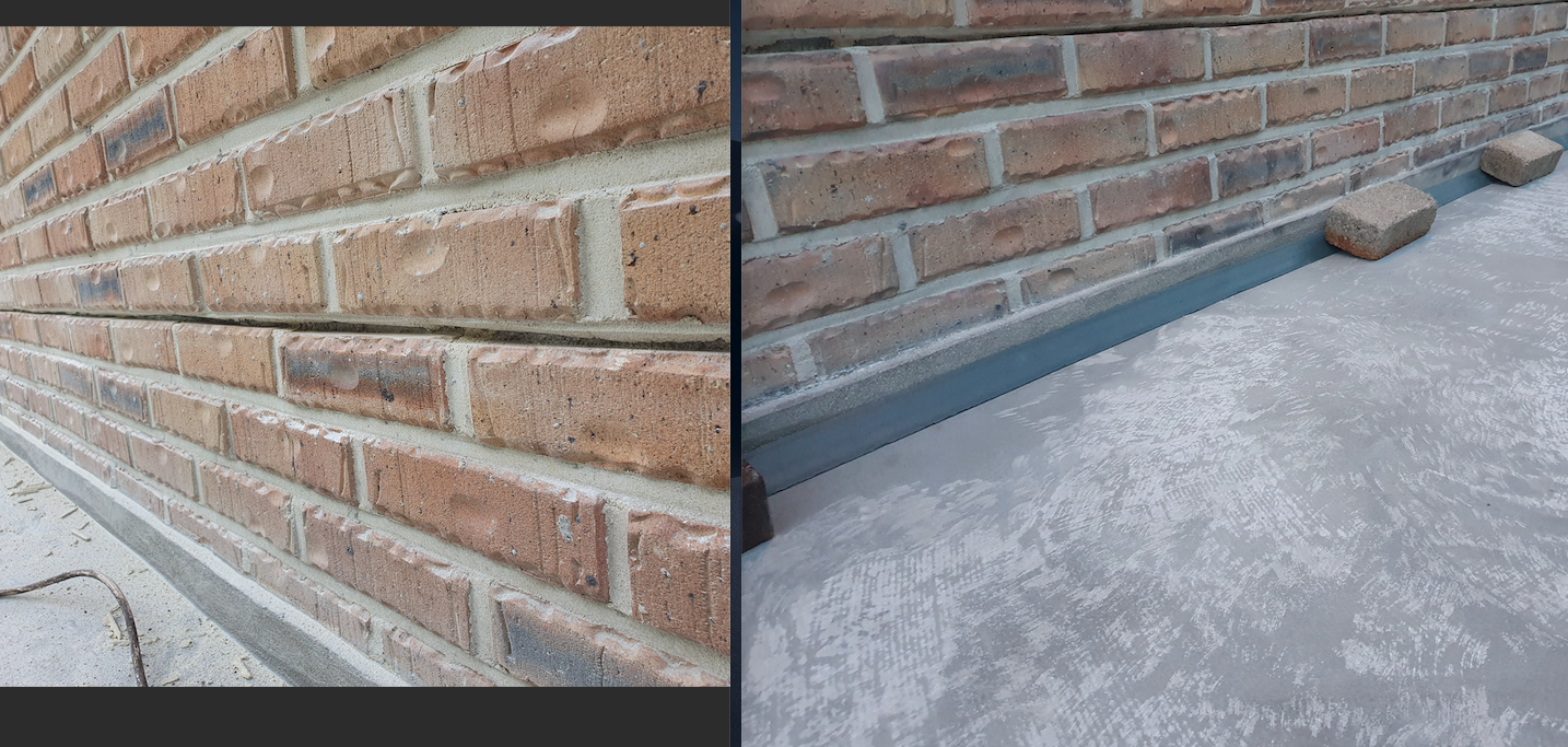 앵커 잘라낸 방수턱의 옆면, 윗면, 벽돌 앵커 구멍, 조적벽이 올라간 2층 기초턱의 사진입니다.