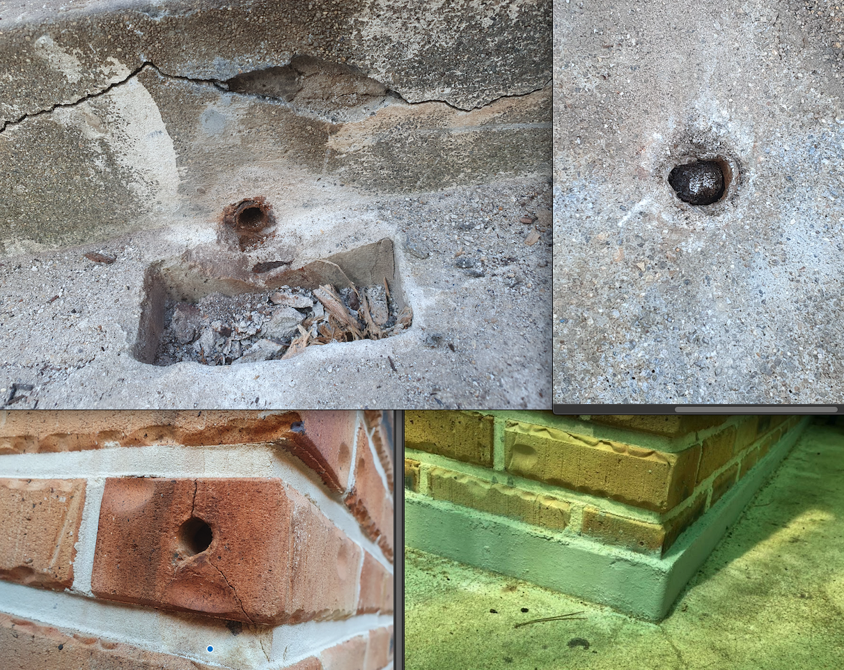 1. 앵커를 잘라내고 나니 남은 볼트가 안으로 들어가서 앵커 캡이 빈 상태가 됐습니다. 벽돌에는 아예 앵커가 빠지고 남은 구멍이 있는데 이런 부위는 모두 녹을 제거하고 초속경 몰탈로 채우려고 합니다.