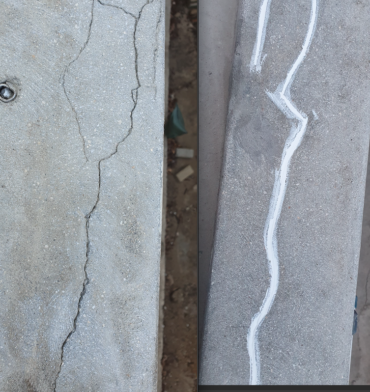 그리고 아래 사진에 크랙이 크게 발생한 곳도 마찬가지로 몰탈로 채울 생각인데 실금이 간 곳은 몰탈로 채워지지 않을거 같아서 시카의 속경화 우레탄 실리콘을 사용하려고 합니다. 이런 방식으로 보수를 진행하면 되는지 궁금합니다.